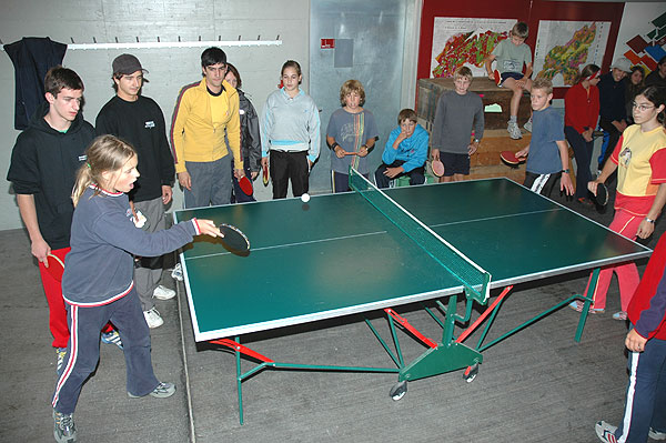 Den äusseren Umständen entsprechend stand heute der Turniertag auf dem Programm. Da wir bis um 8:00 Uhr ausschlafen konnten, waren natürlich alle wieder topfit bei der ersten Turnierrunde. Nach einem kurzen Warm-up spielten die fünf Mannschaften zuerst auf dem nahen Aussenplatz Basketball. Es wurde um jeden Ball und Punkt gekämpft, aber alles im fairen Rahmen. Die ersten Tropfen fielen einem ins Gesicht. Die Annahme, dass es sich um Schweissperlen handelte war nicht zwingend richtig, denn es begann wieder leicht zu regnen. Nach dem Basketball-Block legten wir eine kurze Verpflegungspause ein im Foyer unserer Unterkunft. Im zweiten Block spielten wir dann Hockey. Auch hier gab es auf beiden Seiten Treffer und es gewannen auch mal die Glücklicheren ein Spiel. In der Mittagspause konnten wir uns wieder drinnen aufwärmen bei einer Suppe mit Wienerli. Die Infrastruktur welche uns in der Unterkunft zur Verfügung steht lässt kaum Wünsche offen und ist gerade in Tagen wie heute Gold wert. Nach der Stärkung und einer kurzen Regenerationspause" starteten wir mit der dritten Disziplin, dem Tischtennis. Wiederum kämpften jeweils zwei Mannschaften bei einer "Seklete" um Punkte. Es kam auch vor, dass man dabei versehentlich die eigenen Mannschaftsangehörigen aus dem Spiel warf. Nach dem Abschluss der Tischtennis-Runde mussten wir noch die letzten vier Partien im Hockey fertig spielen. In der Hoffung auf besseres Wetter hatte man diese Spiele auf später verschoben. Doch der Ball rollte dabei bereits tiefer durch die Pfützen auf dem Spielfeld als noch am Vormittag. Die Stimmung hat aber deswegen kaum Einbruch erlitten. Möglicherweise hatte dies auch mit "Guru" Andreas Steiners 20. Geburtstag einen Zusammenhang. Kamen doch alle deswegen in Genuss eines feinen Znünis und eines Dessertbuffets nach dem Nachtessen. Nach dem Turnier war eine warme Dusche natürlich wieder sehr wohltuend. Der Appetit der Teilnehmer zeigte sich auch beim Nachtessen wieder. Vom feinen Riz Casimir blieb kaum etwas übrig. Im folgenden Abendprogramm gab es dann eine Lagerkino-Vorstellung mit dem Film "Wallace & Gromit auf der Jagd nach dem Riesenkaninchen". Natürlich hätte niemand schlafen können ohne zu wissen, wer nun als Sieger des Turniers hervor ging. Die folgende Rangverkündigung brachte dann das Resultat zu Tage. Als Sieger feiern konnte sich die Gruppe 5 mit Kurt Bühlmann, Angelika Schmid, Mario Stofer, Samsan Sivanathan, Senta Gasser und dem Geburtstagsjubilar Andreas Steiner.