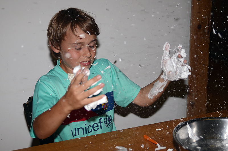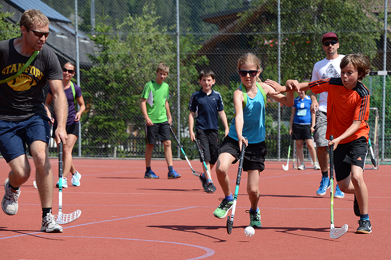 Nach einem gemütlichen Zmorge stand heute der erste Teil des Turniertages auf dem Programm. Dazu spazierten wir zuerst zum Schulhaus in Kandersteg, wo wir einen tollen Sportplatz mit Kunststoff Belag benutzen konnten. Eröffnet wurde das Turnier mit der Sportart Handball. Vier Mannschaften kämpfen (meist) fair um Tore und Punkte. Als zweite Disziplin wurde Unihockey gespielt, wo ebenfalls alle Spieler mit viel Einsatz und Elan die einzelnen Partien bestritten. Es gab kaum jemand, dem nicht die Schweissperlen von der Stirn hinunter tropften. Der Vormittag verstrich wie im Nu. Unsere Lagerküche brachte uns das Essen auf den Platz, wo wir Salate und Wienerli im Teig geniessen konnten. Der Badi, welche gleich neben dem Sportplatz liegt, statteten wir nach dem Essen einen Besuch ab. Schnell waren (fast) alle im Wasser und genossen das erfrischende Nass, welches gemäss Schild auf 26°C geheizt war... Die Lufttemperatur lag jedoch tiefer. Nach einer Stunde machte sich dann das Nass auch von oben bemerkbar, die umliegenden Berggipfel waren in Wolken verhüllt und es setzte ein leichtes Gewitter ein. Die Badi bot aber auch im Inneren genügend Platz, so dass sich eine grosse Schar um den Pingpongtisch versammelte. Das Gewitterintermezzo war glücklicherweise nur von kurzer Dauer, so dass wir trocken ins Lagerhaus zurückkehren konnten. Wann immer sich Zeit findet sitzen die meisten Lagerteilehmer in den letzten Tagen zusammen um "Werwolf" zu spielen: Ein Rudel Werwölfe treibt sein Unwesen und jede Nacht fällt seinem unstillbaren Hunger ein Dorfbewohner zum Opfer. In dem Bestreben, das Übel auszurotten, greifen die Dorfbewohner ihrerseits zur Selbsthilfe und der einst beschauliche Ort wird zur Bühne für ein erbittert geführten Kampf ums nackte Sein. Dies ist eine kurze Erklärung der Spielsituation wo jeder Spieler eine bestimmte Rolle einnimmt um sein Ziel zu verfolgen. Da man jedoch selbst als Werwolf nicht wirklich satt wird freut man sich auf das richtige Nachtessen, wo heute Spätzligratin und Salate auf der Menükarte standen. Nach dem Essen und der Erledigung aller Gruppenämtlis wurde noch ein Lager-Toto durchgeführt. In 11 Auslosungen standen sich immer 2 Teilnehmer gegenüber die den Sieg unter sich ausmachten. Es mussten meist Geschicklichkeitsaufgaben auf Zeit gelöst werden. Schlussendlich gingen gleich 6 Sieger aus dem Toto hervor welche am häufigsten (8x) auf die richtigen Sieger getippt hatten. Da morgen wieder ein Wandertag auf dem Programm steht kehrte nach dem Toto bald Ruhe im Lagerhaus ein.