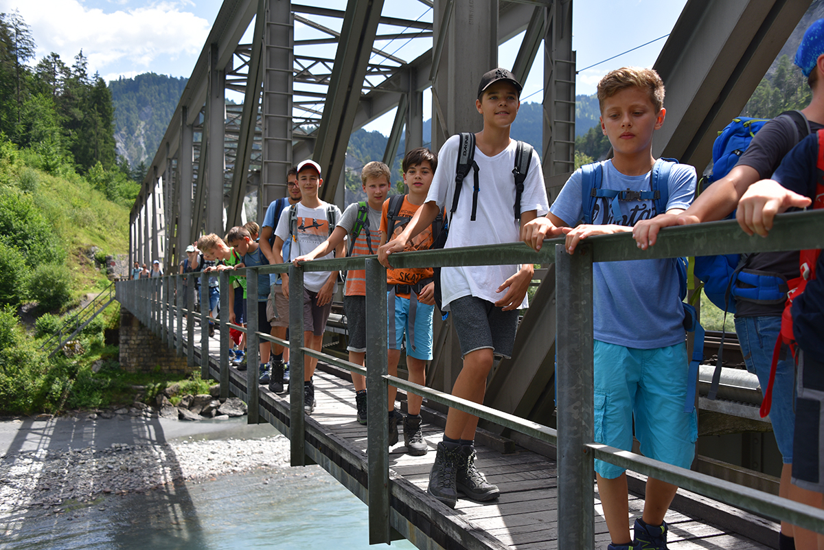 Das Lauschen auf die Bahnhofdurchsage und das Umsteigen an den Bahnhöfen erübrigte sich heute. Für einmal brachte uns der Car ans Ziel, oder mindestens in die Nähe. Nach einer zweistündigen Fahrt erreichten wir Flims, wo wir ausstiegen. Der Car fuhr dann ohne uns aber mit dem Gepäck weiter nach Andiast. Beim Sportzentrum Flims stand den Lagerteilnehmern ein sportlicher Einstieg in die Lagerwoche bevor. Nein, es war nicht der Hochseilpark, auch wenn sich einige dies durchaus gewünscht hätten. Unser Ziel war die Rheinschlucht. Zu Fuss marschierten wir bei prächtigem Sonnenschein durch den Wald, vorbei am türkisblauen Caumasee. Nach einer guten Stunde erreichten wir die spektakuläre Aussichtsplattform Il Spir in Conn. Uns eröffnete sich dort ein toller Blick in die «Ruinaulta» zu der Stelle, wo sich der Rhein durch die Felsen schlängelt. Nun wussten wir, welcher Abstieg uns noch bevorstand. Diesen meisterten wir natürlich problemlos und bald standen wir unten am Fluss und bewunderten die Gesteinserosionen von unten. Am Fluss hatten wir auch reichlich Zeit für eine gemütliche Mittagspause. Das Rheinufer bot für alle etwas und wenige blieben komplett trocken. Entweder war es das erfrischende Nass vom Rhein oder dann der Schweiss welcher bei „düppigem“ Wetter die Stirn hinunter ran. Bis zur RhB Station Versam war es nicht mehr weit. Unerwartet aber willkommen war dort die Glace, welche alle spendiert bekamen. Den oberen Teil der Rheinschlucht betrachteten wir dann aus dem Zug, welcher uns nach Ilanz brachte. Nun mussten wir doch noch an einem Bahnhof umsteigen. Uns erwartete dort das Postauto, welches uns auf der Bergstrecke nach Andiast brachte. Die Kirchturmuhr schlug 16 Uhr, als wir das Ziel erreicht hatten. Vor dem Lagergebäude stand unser Gepäck, welches noch 4 Stockwerke hinuntergetragen werden musste. Schnell waren die Schläge bezogen und kurz darauf wurde drinnen fleissig Pingpong oder draussen Fussball gespielt. Die heutige Einlauftour konnte also nicht so streng gewesen sein. Um 18:30 Uhr trafen sich wieder alle zum Nachtessen. Während man beim Salat noch zögerlich schöpfte langte man bei den Spaghetti umso fester zu. Davon gab es keine Resten mehr. Draussen windete es schon seit einiger Zeit und nun setzte auch Regen ein, der mit Blitzen untermalt wurde. Nach dem Essen widmeten sich diejenigen, welche noch keinen Ämtlijob hatten dem „Werwölflen„, während in der Küche fleissig abgewaschen oder die Duschen gereinigt wurden. Dies gehört eben auch dazu. Um 20:30 Uhr war dann der nächste Fixpunkt für alle. In der lagereigenen Turnhalle(!) lernten sich die Lagerteilnehmer bei verschiedenen Spielen besser kennen. Wir haben eine tolle Lagergruppe zusammen!
