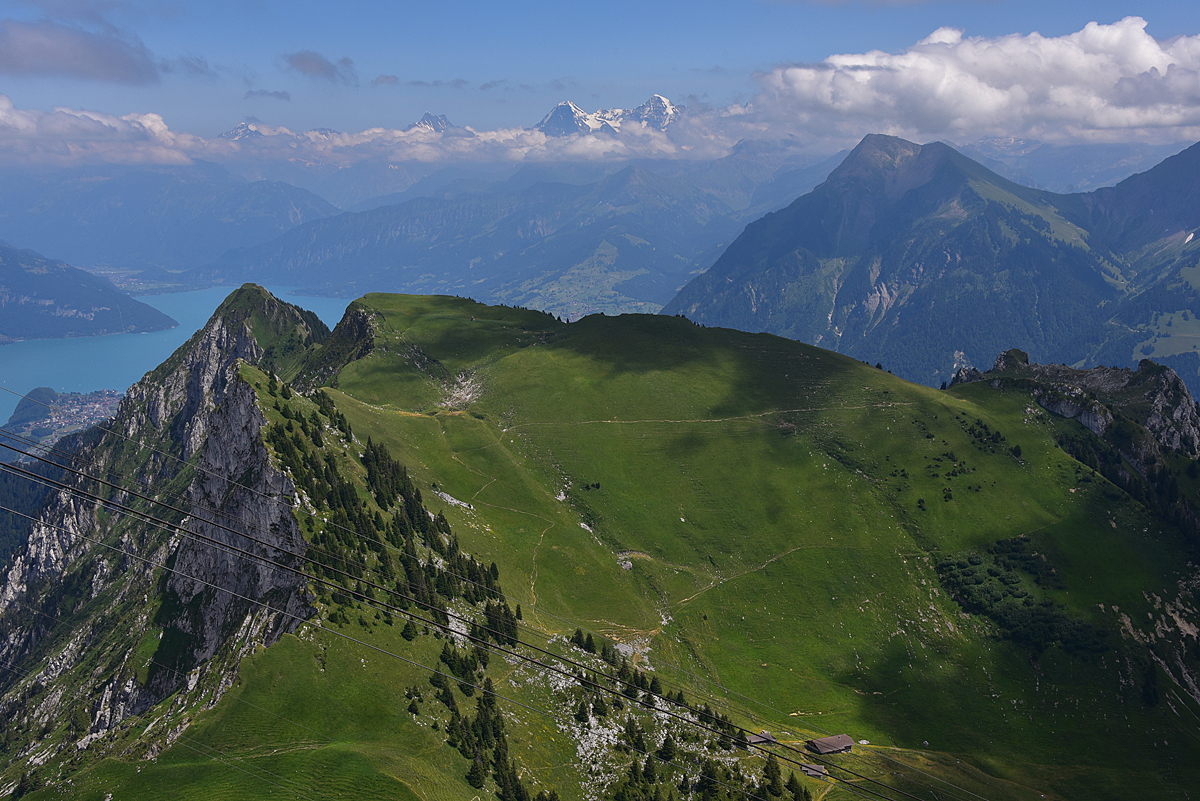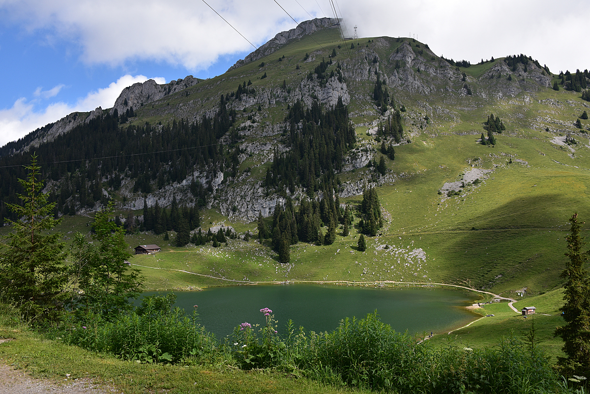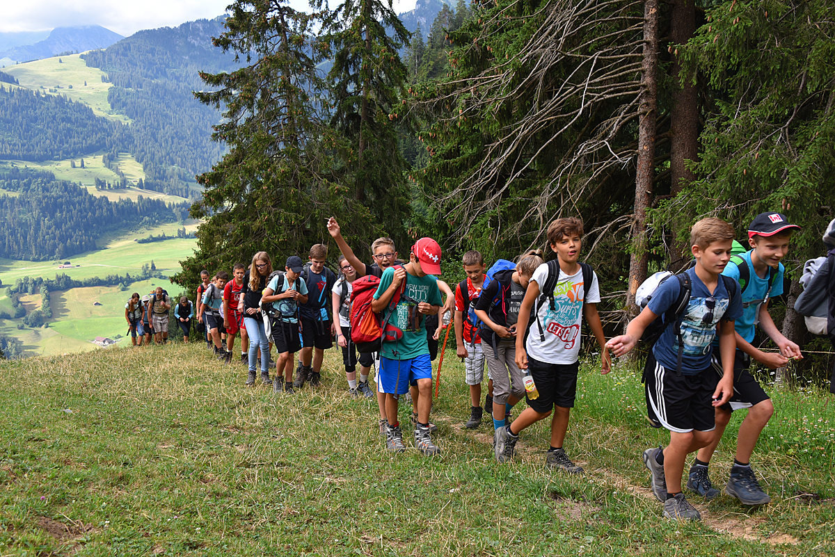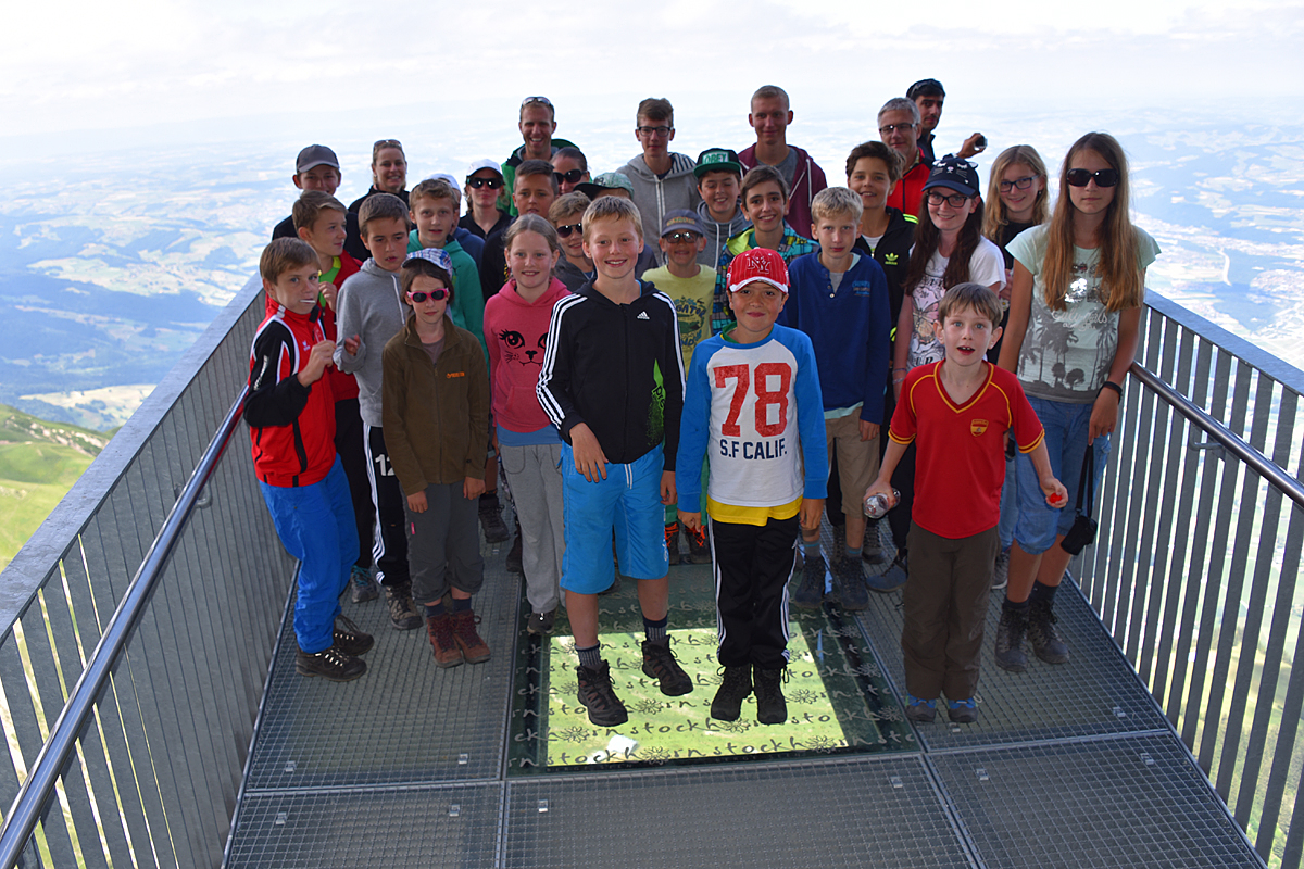 Um 6:40 Uhr verliessen wir das Lagerhaus Richtung Talstation Wiriehornbahn, wo sich die Postautohaltestelle befand. Das Postauto fuhr uns dann nach Oey und von dort aus gelangten wir nach einer 2-minütigen Bahnfahrt nach Erlenbach (680m.ü.M), dem Ausgangsort unserer Wanderung und somit der Einstieg zum Aufstieg. Der Wegweiser beim Bahnhof zeigte bereits zum Ziel: Stockhorn 4 ½ Std. Die Mittelstation der Stockhornbahn erblickten wir 900m über uns. Der Himmel war bedeckt und die Temperatur kühl, was uns zu diesem Zeitpunkt jedoch entgegen kam. Im gleichmässigen Tempo kamen wir immer höher. Um 10:45 Uhr erreichten wir den Hinterstockensee, wo eine stündige Pause vorgesehen war. Die Fischer am See hatten offenbar ein dickeres Fell als wir es hatten, ihnen machte der kühle Wind weniger aus als uns. Selbst in langen Hosen und Windjacken war es für uns bloss ein verharren, so dass wir uns zeitig auf den weiteren Weg machten. Die Bergstation des Stockhorns wurde inzwischen sichtbar, die Wolken klammerten sich aber noch immer dicht an den Gipfel. Via Oberstocken führte uns der Weg weiter in die Höhe bis wir schlussendlich um 12:40 Uhr die Bergstation erreichten. 1400 Meter Aufstieg waren geschafft! Wir deponierten unsere Rucksäcke und nahmen die letzten Meter bis zum Gipfel in Angriff, um das Rundpanorama zu erblicken. Die Wolken wurden aber wieder dichter und Richtung Norden folgte der Blick ins Leere rsp. Weiss. So gingen wir wieder zurück zur Bergstation und assen unseren Lunch auf der Picknick Terasse. Mit der Zeit wurde es immer wärmer und in der Ferne erblickten wir plötzlich die Gipfel von Eiger, Mönch und Jungfrau. Von der Bergstation führt ein Stollen durch den Berg direkt zur Nordwand, wo eine Aussichtsplattform angebracht war. Der Gitterboden mit einem Glaseinsatz gab auch den Blick senkrecht in die Tiefe frei. Nichts für Leute mit Höhenangst, aber es hatte durchaus etwas reizvolles an sich. Jetzt konnten wir auch in diese Richtung den Fernblick geniessen, unsere Mühen des Aufstieges wurden doch noch belohnt. Thun lag uns zu Füssen und das weitere Panorama erläuterte die Tafel bei der Plattform. Die Aussicht vom Stockhorn (2190m) kann absolut weiter empfohlen werden. Wir hatten genug Zeit, das Gipfelfeeling zu geniessen und alle kamen zudem noch in den Genuss einer Gipfelglace. Erwähnenswert ist sicher auch, dass alle Teilnehmer und die komplette Lagercrew den Gipfel erklommen haben. Um den Abstieg musste sich niemand mehr Gedanken machen, um 15:00 Uhr brachte uns die Luftseilbahn ins Tal zurück nach Erlenbach. Weiter ging es mit Bahn und Postauto, bis wir wieder zurück im Lager waren. Unserem Postautochauffeur wurde zum Schluss noch ein Applaus beschert, er chauffierte uns direkt vor das Lagerhaus. Wir waren diese Woche ein paar Mal mit dem Postauto unterwegs und „unser“ Chauffeur hatte uns immer einen tollen Service geboten und uns, wo möglich, mit Tipps unterstützt. Der nächste Fixpunkt im Programm war das Abendessen, bei welchem es Älplermagronen mit Apfelmus gab. Abgerundet wurde der Abend kulinarisch mit einem feinen Schoggimousse. Obwohl heute der Himmel bis am frühen Nachmittag bedeckt war trugen einige einen leichten Sonnenbrand davon. Kühlung auf jede Art war willkommen.
