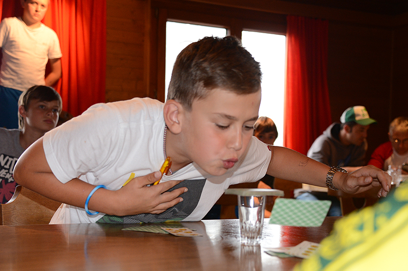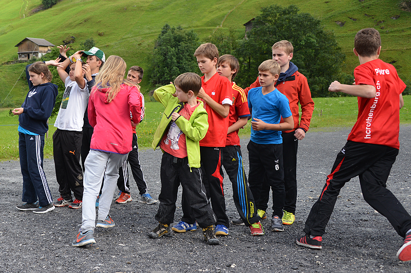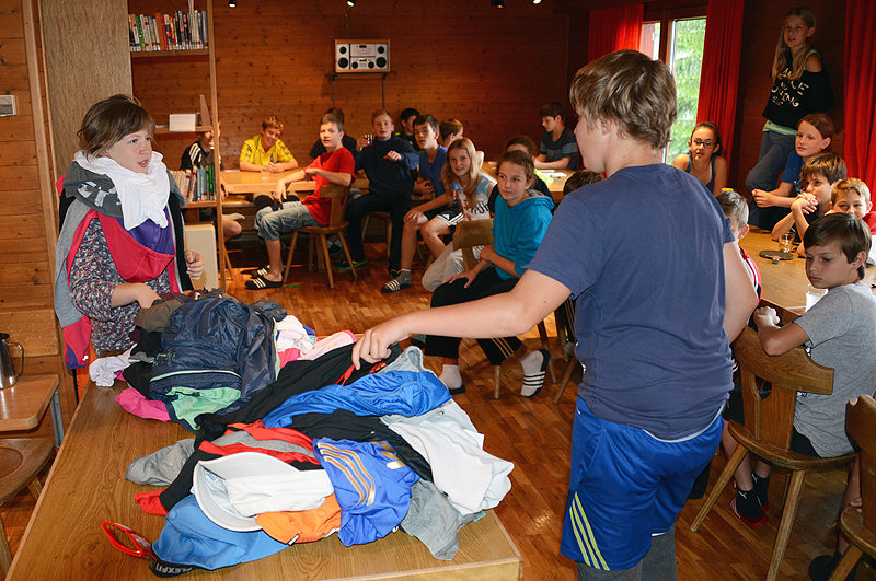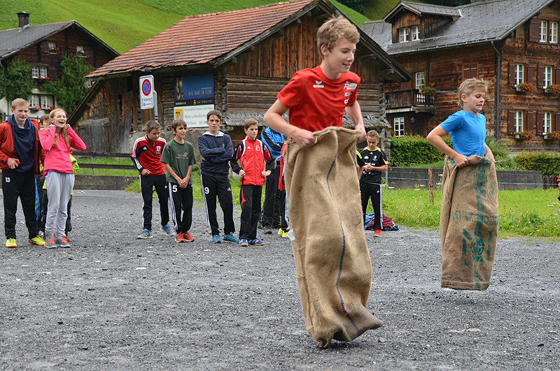 Angesichts der Tatsache, dass die Sonne draussen in Strömen schien zogen wir es vor, den Vormittag im Haus zu verbringen. Nach dem Morgenessen starteten wir zum Lagertoto. Dazu gab es 11 Wettbewerbe, zu denen je 2 Personen ausgelost wurden, welche später gegeneinander antraten. Vorgängig tippten aber alle auf ihre erwarteten Gewinner. Die Tippspiele umfassten beispielsweise Musikstücke erkennen, Geschicklichkeitslauf, Zeitungsartikel suchen, Kartenhaus bauen, möglichst viele Kleider anziehen usw. In einer Begegnung ging es auch darum, dass ein "Modell" möglichst originell geschminkt werden musste. Das faszinierte offenbar derart, dass nach dem Toto sich die meisten gegenseitig zu schminken begannen. Das JuBla Lager oberhalb von uns wäre in Bedrängnis geraten hätten sie die Ergebnisse mitbekommen... Den restlichen Morgen verbrachten wir je nach Lust mit Tischtennis, Töggele, Dog, "Hose ab" oder anderen Spielen. Während dessen bereitete die Küche die heiss begehrten Fotzel- und Käseschnitten zu, die es als Mittagsverpflegung gab. Trotz all der Spiele im Haus war es wichtig, dass alle nochmals Frischluft und Bewegung draussen bekamen und so begaben wir uns bald mit den Gondelbahnen ins Tal hinunter. Auf den leeren Parkplätzen (wer wollte heute schon freiwillig in die Berge...) konnten wir verschiedene Stafetten durchführen. Nachdem Petrus uns zu Beginn noch einmal kräftig geduscht hatte hörte der Regen für ein paar Stunden auf und wir erlebten sogar noch ein paar Sonnenstrahlen, welche durch die blauen Löcher schienen. Die Stafettenläufe dauerten gute 2 Stunden und die motivierten Olympia-Mannschaften gaben bis zuletzt alles. Wieder oben auf dem Ampächli liessen es die Verhältnisse sogar noch einmal zu, auf den Trampolins herum zu hüpfen. Schon die ganze Woche genossen wir feines Essen, aber die Küche setzte noch einmal eins drauf und punktete zusätzlich mit den Pizzas beim Nachtessen. Mit dem Ende des Lagers endete auch die Olympiade und es folgte die allerletzte Rangverkündigung. Nach alle den vielen Wettkämpfen konnte das Team Russland die höchste Stufe des Podests erklimmen. Der Siegermannschaft angehört haben David Widmer, Gregory Wagner, Nicolas Loser, Noah Thürig und Michèle Möri. Ganz nach dem Motto "eine gute Zeit sollte man mit einer würdigen Party abschliessen" legte zum Abschluss "DJ Stadtrambo" im Keller noch Musik auf. Die Jungs und Mädels mussten also nicht einmal mehr das Lagerhaus verlassen für einen Discobesuch. Die Nachtruhe fand etwas später als üblich statt, so dass alle noch so richtig abtanzen konnten.