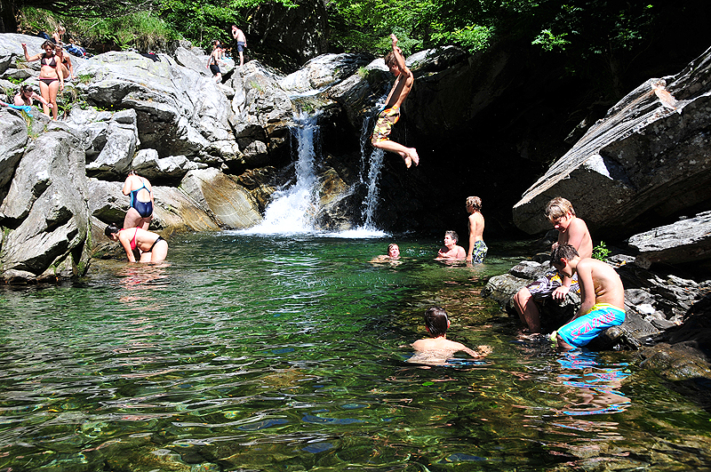 Bereits bei der Tagewache um 6:30 Uhr war der Himmel blau. Die Sonne brauchte aber noch etwas Zeit, bis sie das Tal erreichte. Natürlich genossen wir das feine Frühstück, es gab frischer selbstgebackener Zopf, wieder draussen. Um 8 Uhr verliessen wir dann, mit viel Getränk im Rucksack, das Lagerhaus. Unser Ziel war das Val del Slato, welches sich östlich von Maggia öffnet. In Maggia angekommen erfolgte der erste Aufstieg auf der rechten Talseite. Die Temperaturen stiegen ebenfalls hoch Richtung 30°C. Ein leichter Wind und der Schatten der Bäume machten den Aufstieg angenehm. Erstaunlich war schon, wie der (Berg-) Weg präpariert war. Dass das Tessin über viel Granit verfügt ist bekannt. Dass aber die Wege mit Granitsteinen präpariert waren regte zum Denken an. Wer macht sich solch eine grosse Mühe Steinstufen in diesem Gelände und in dieser Höhe zu verlegen? Nach knapp drei Stunden erreichten wir die Stelle, wo wir die Talseite wechselten und eine ausgiebige Mittagsrast genossen. Es war ein lauschiger Platz wo der Bergbach gestaut wurde, welcher zum erfrischenden Baden einlud. Auf der linken Talseite erfolgte dann der Abstieg, mit teils „interessantem“ Tiefblick ins Tal. Je tiefer wir kamen desto höher lagen die Temperaturen. So machten wir es dann wie viele Einheimische, wir gingen in der Maggia (nochmals) baden. Zurück in der Unterkunft konnte alle noch etwas Zeit nach Lust und Laune verbringen bis zum Nachtessen. Auf der Menukarte stand heute Tessiner Braten mit Polanta und Fenchel, was wir uns schmecken liessen. Da Morgen mit dem Sporttag keine frühe Tagwache auf dem Programm steht gab es am Abend noch einen Openair Kinofilm. «Bienvenue chez les Ch'tis», ein humorvoller Film über einen französischen Postbeamten der strafversetzt wird.