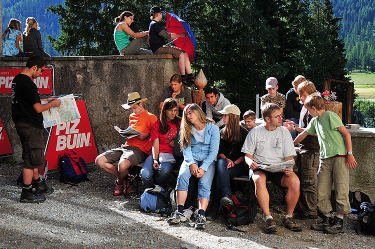 Der letzte Lagertag bedeutet auch immer für Tagwache. Um 6:00 Uhr war es mit der Ruhe vorbei und noch vor dem Morgenessen wurde sämtliches Gepäck aus den Zimmern geräumt. Da wir im Lager mit Mario Stofer noch ein zweites Geburtstagskind unter uns hatten kamen beim Morgenessen Alle in den Genuss eines Gipfels. Anschliessend galt es am Morgen die 5 Stockwerke unseres Lagerhauses bis in alle Ecken zu reinigen. Draussen schien die Sonne, es war ein prächtiger Tag und mach ein Teilnehmer wünschte sich nochmals eine tolle Bergwanderung zu unternehmen anstelle der Putzerei. Um 9:45 Uhr nahmen wird dann endgültig Abschied von Madulain. In einem 1½ stündigen Spaziergang wanderten wir noch Richtung Unterengadin bis nach S-chanf, wo wir dann den Zug bestiegen. Die Rückfahrt mit der RhB erfolgte durch das Prättigau. Um 16:29 Uhr erreichten wir dann den Bahnhof Rothenburg-Station wo die Lagerwoche mit dem Abschied voneinander endgültig endete. Rückblickend hatten wir wieder ein tolles und abwechslungsreiches Lager. Auch wenn das Wetter zu Beginn der Woche noch nicht so toll war, der tollen Stimmung tat dies keinen Abbruch. Alle Teilnehmer erwiesen sich als sehr homogene Gruppe, wo niemand abfiel bei all den verschiedenen Aktivitäten. Es war toll mit euch und hoffentlich seit ihr auch nächstes Jahr wieder mit dabei. Dass das Lager gelingen konnte, dafür sorgten zu einem grossen Teil auch die Leiter und das Küchenteam. Ihnen gebührt sicher ein herzlicher Dank. Einen Dank richtet sich auch an die vielen Sponsoren welche das Lager in irgendeiner Weise unterstützt haben. Somit Allen nochmals besten Dank und auf Wiedersehen bis im nächsten Sommer.