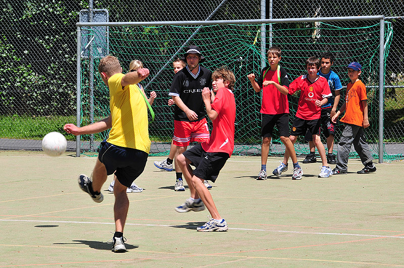 Da die Tagwache (auch) heute nicht allzu früh war, wurden wir um 7:30 Uhr von den Sonnenstrahlen aus den Betten geholt. Stahlblauer Himmel war uns für den Turniertag beschert. Auf dem Sportplatz im Dorf oben starteten fünf Mannschaften. Die erste von drei Disziplinen war Hockey. Die Unterlage war zwar nicht vereist, aber wegen des Sandes auf dem Kunstrasen auch ziemlich rutschig. Gekämpft wurde um jedes Tor. Sieger und Verlierer gingen vom Platz nach den einzelnen Spielen, die jeweils fair verliefen. Nach der Hockeyrunde war der Vormittag bereits vorüber und wir begaben uns zurück in Lagerhaus, wo es ein Mittagessen gab zur Stärkung. Teigwarengratin mit Servelatstücken und verschiedene Salate. Am Nachmittag kehrten wir zum Turnierplatz zurück um als nächste Disziplin den Fussball auszutragen. Die dritte Disziplin war ein Novum im Lager, es wurde nämlich erstmals Handball gespielt. Das Turnier zog sich bis um 18:00 Uhr hin, ehe alle wieder ins Lagerhaus zurückmarschierten in der Hoffung, einen Siegerplatz errungen zu haben. Das Küchenteam verwöhnte uns heute zum Znacht mit Chügelipastetli, Reis und Erbsli. Ob es genau zutrifft oder nicht war unerheblich, aber JJ, Thöse und Joel spendierten für ihre gemeinsamen 40 Lagerteilnahmen allen eine Cornetglace zum Dessert, ehe die Rangverkündigung durchgeführt wurde. Als Sieger des heutigen Tages ging die Gruppe 2 mit Yvonne Ottiger, Serverin Kurt, Pacsal Möri, Lukas Gretener, Luca Nicolussi, Joel Kritzer, Pascal Reinert und Billy Wigger hervor. Den weiteren Abend verbrachten die meisten draussen vor dem Lagerhaus bei Spiel und Sport nach Lust und Laune, und genossen so noch den schönen Abend.
